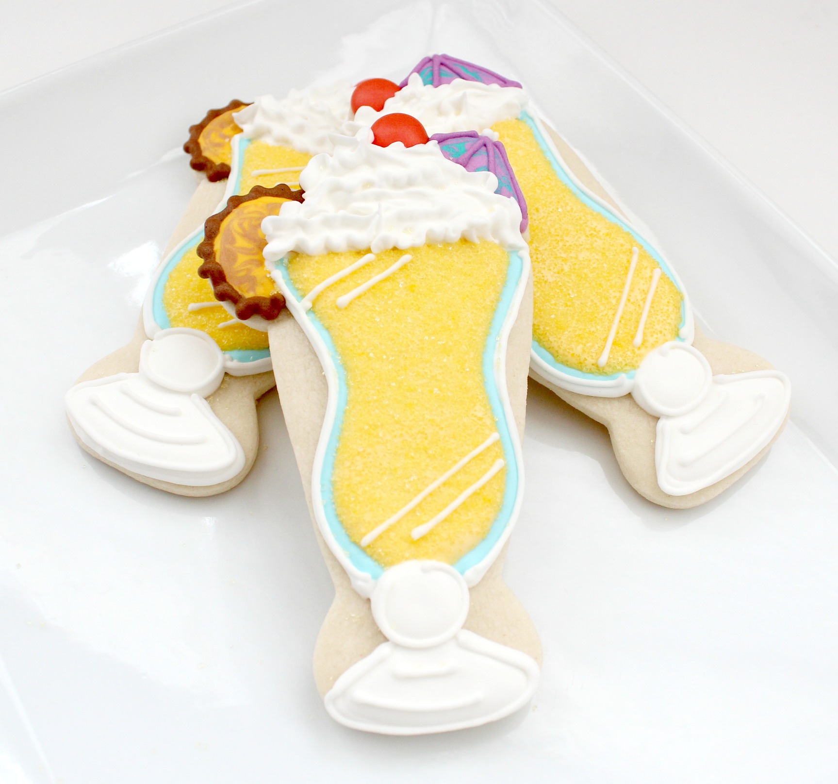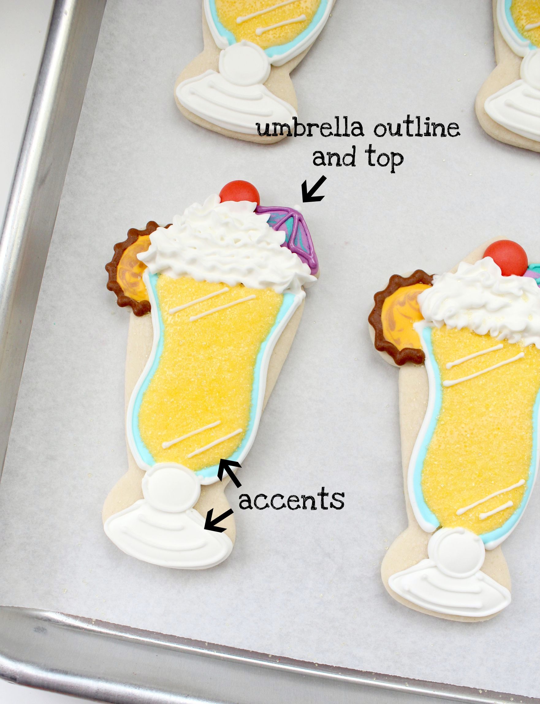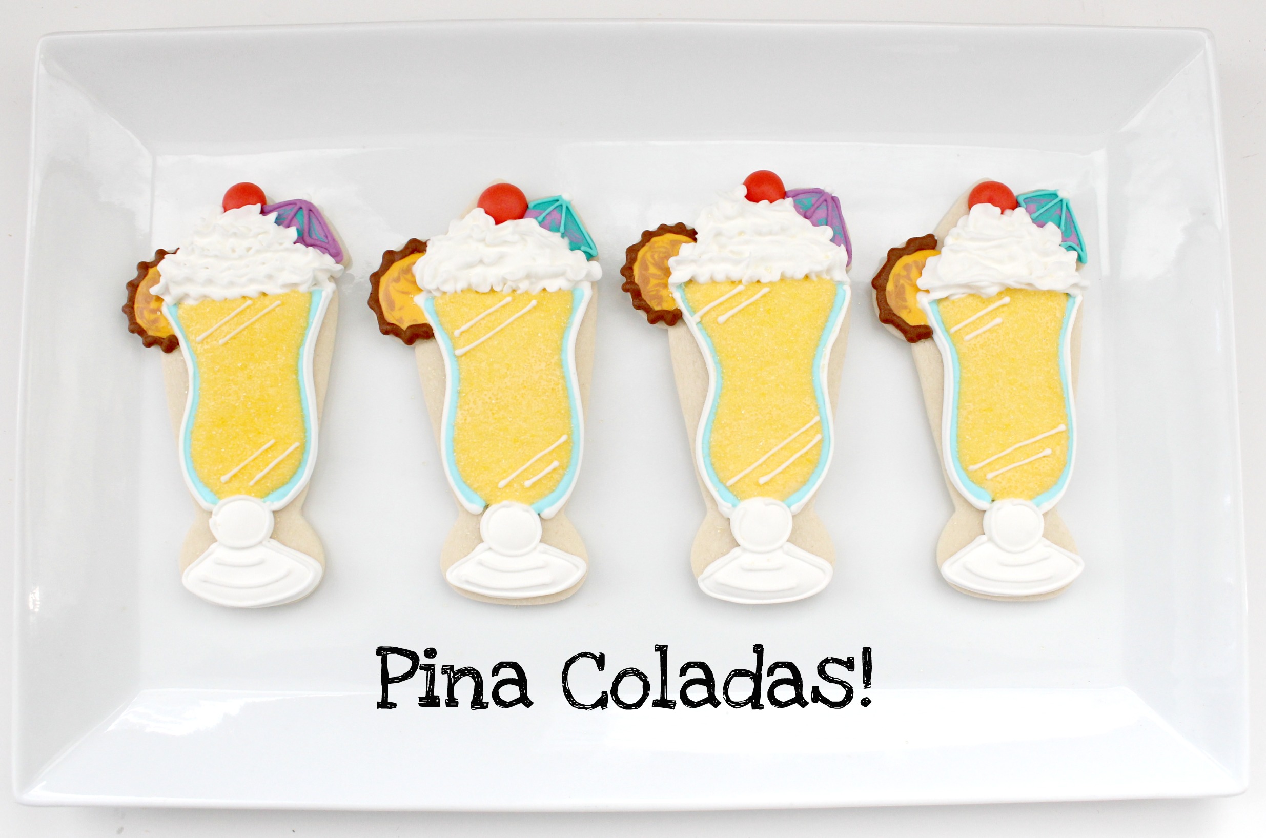 This is my first ever pina colada cookie {I won’t even tell you how long it took me to make these} The ones you see today is how they’ve evolved as my decorating skills improved. There is about a two year jump between these cookies. Also, I thought it would be funny to mention, the black outlining here was NOT planned, but rather a fix, because this cookie did not turn out at all like I’d expected!