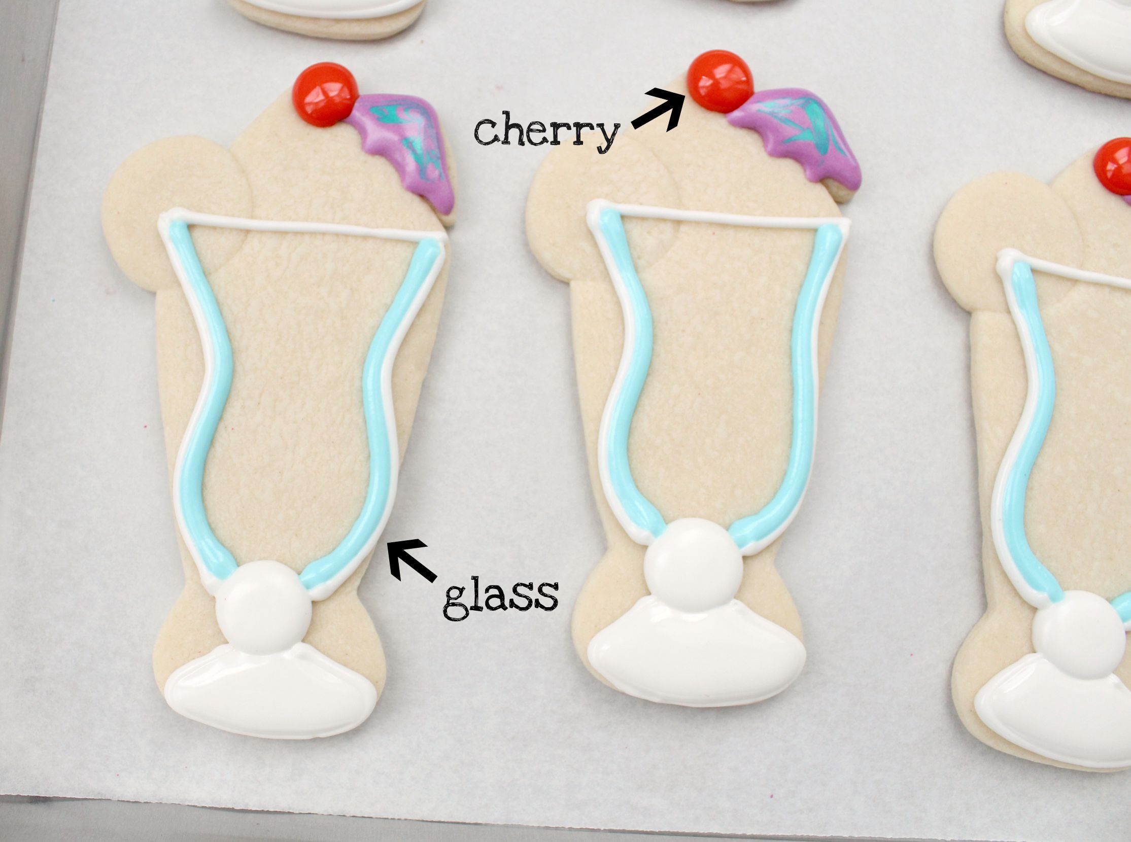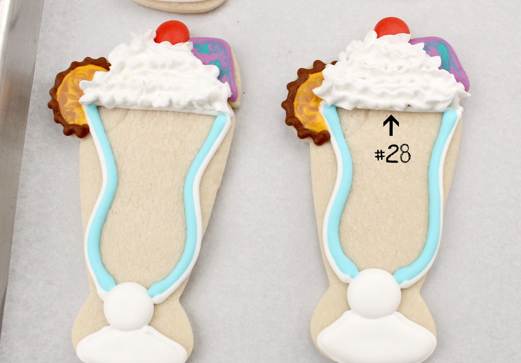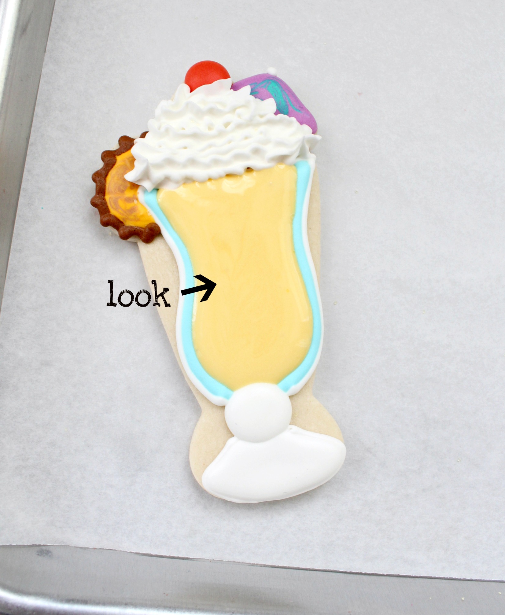 This is my first ever pina colada cookie {I won’t even tell you how long it took me to make these} The ones you see today is how they’ve evolved as my decorating skills improved. There is about a two year jump between these cookies. Also, I thought it would be funny to mention, the black outlining here was NOT planned, but rather a fix, because this cookie did not turn out at all like I’d expected!