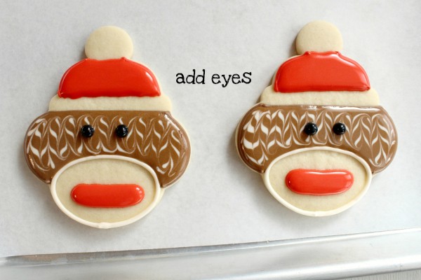 Let them dry, and you’ll have sock monkey Santa Cookies. If you want regular old sock monkeys, follow the same steps, just change the red portion of the hat to ivory, and the white to red. Confused yet?