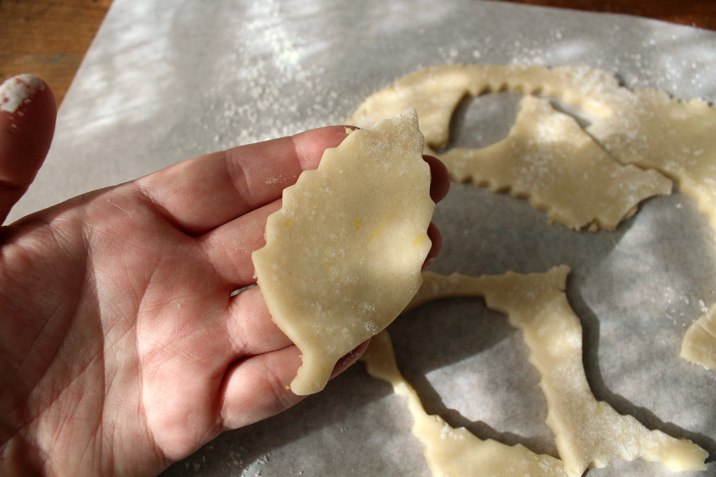 4. When the dough is well chilled, roll to a 1/8-1/4 inch thickness on floured parchment paper and use a cookie cutter to cut into desired shapes. Place on a parchment lined cookie sheet.