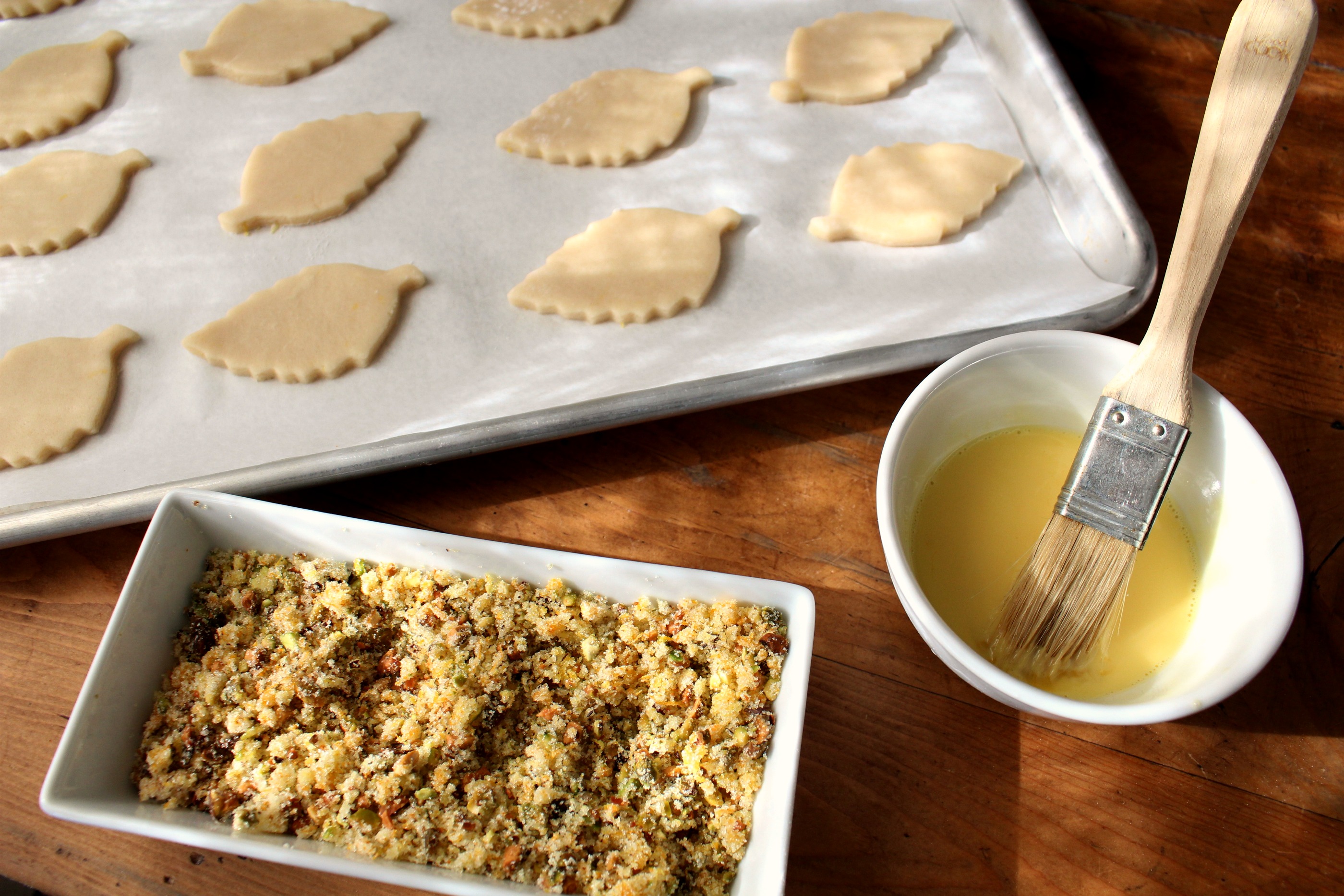 5. Before baking, whisk together the egg yolks, juice, and half and half. Brush the cutouts with a bit of egg mixture and sprinkle with pistachio sugar. Bake at 350 for 6-10 minutes until edges are slightly browned.
