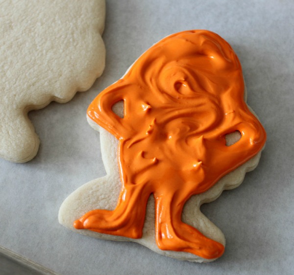 Begin by outlining the cookie and immediately filling it with piping icing. Yes, you heard me right…piping icing. When the outline is filled, swirl the icing around with a toothpick or popsicle stick to give Mr. Lorax a fuzzy look.