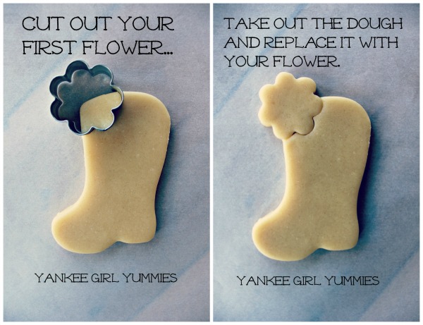 Cut out a boot and three flowers for each cookie that you need. Don’t toss that flower cookie cutter into the sink just yet-you’re going to need it again!